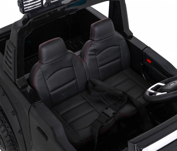 Bezpečnost a pohodlí jsou na prvním místě: sedadla z eko kůže s bezpečnostními pásy, třístupňové nastavení sedadel a dálkový ovladač 2,4 GHz s funkcí STOP dávají rodičům plnou kontrolu. Bohatá světelná výbava (LED, podsvětlené podvozkové prvky, zadní oblouk i kabina) a audio panel s MP3/AUX/USB vytvoří autentický zážitek jako ve skutečném voze.