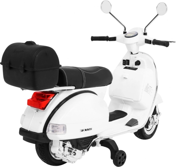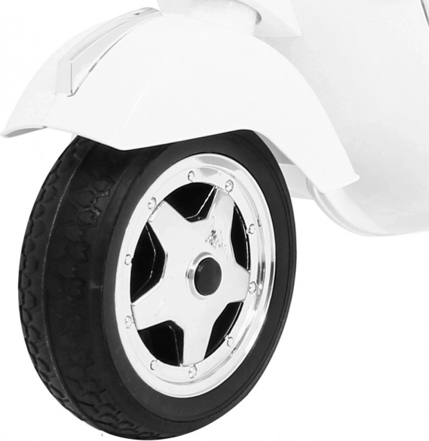 Dětský elektrický skútr Vespa v elegantní bílé barvě je ideální společník pro malé jezdce, kteří touží po stylové a bezpečné jízdě s pomocnými kolečky a plynulým rozjezdem.