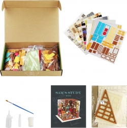 Vše potřebné je součástí balení – od předřezaných dílů z překližky přes papírové a látkové prvky až po lepidlo, barvy a štětec. Stavba zahrnuje barvení a lepení, práci s drobnými detaily a trpělivé skládání, což z ní dělá ideální projekt pro klidný víkend.