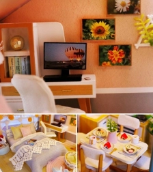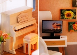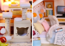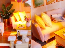 Model je vyroben z kombinace dřeva, papíru a látky, díky čemuž působí realisticky a kvalitně. Interiér zdobí miniaturní nábytek a dekorace, které podtrhují atmosféru malého domova. LED světla (napájená 2× AAA, nejsou součástí) dodají scenérii živost a večer vytvoří příjemnou náladu.