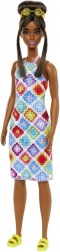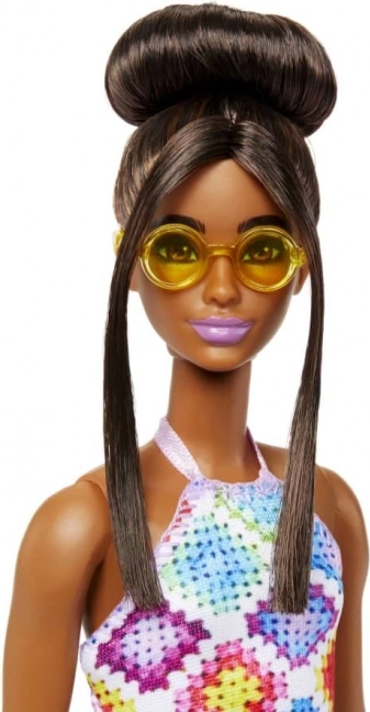 Panenka BARBIE Fashionistas oslavuje rozmanitost a osobitý styl. Je oblečena do výrazných šatů s geometrickým, patchworkovým vzorem, které září barvami i v pošmourný den. Elegantní účes s drdolem a prameny kolem obličeje doplňují stylové brýle a módní sandály – připraveno na každé dobrodružství.
