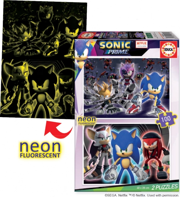 Užijte si zábavu s dvěma neonovými puzzlemi Sonic Prime od EDUCA, které svítí ve tmě díky speciální fluorescenční vrstvě. Každé puzzle má 100 dílků a rozměry 40 x 28 cm.