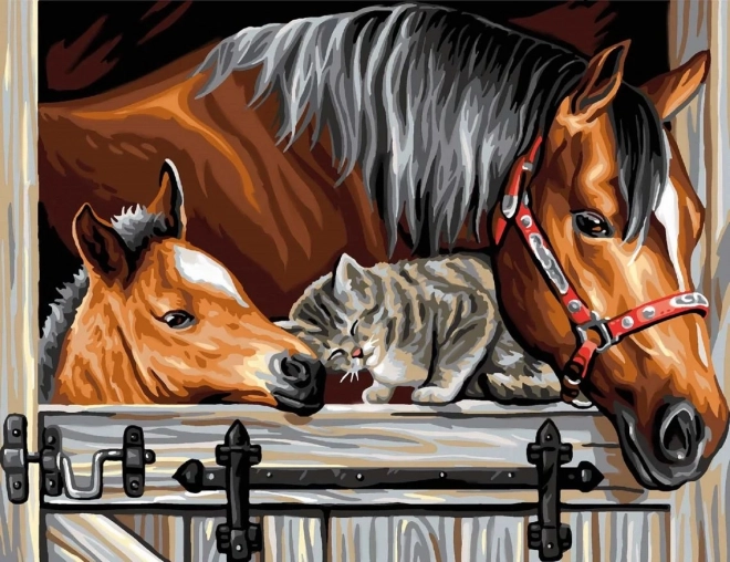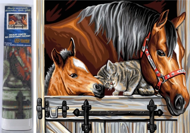 Diamantové malování je kreativní zábava pro každého, která nabízí hodiny příjemné relaxace. Pomocí aplikačního pera budete lepit drobné „diamantové“ kamínky na označená místa na plátně a postupně vytvoříte třpytivý obraz s motivem koní a kočky. Nepotřebujete žádné umělecké dovednosti – stačí následovat legendu symbolů.