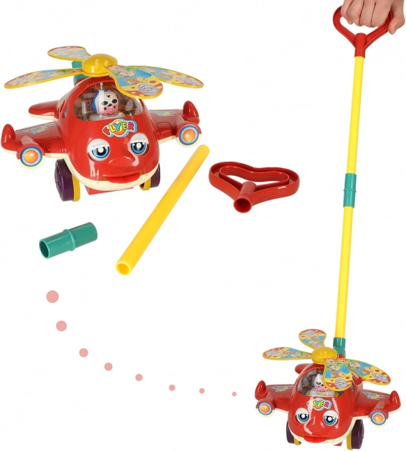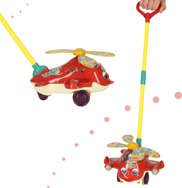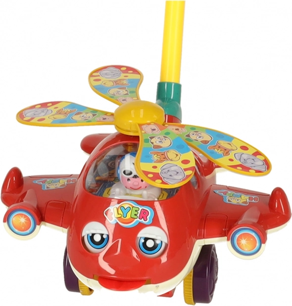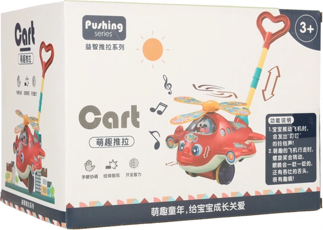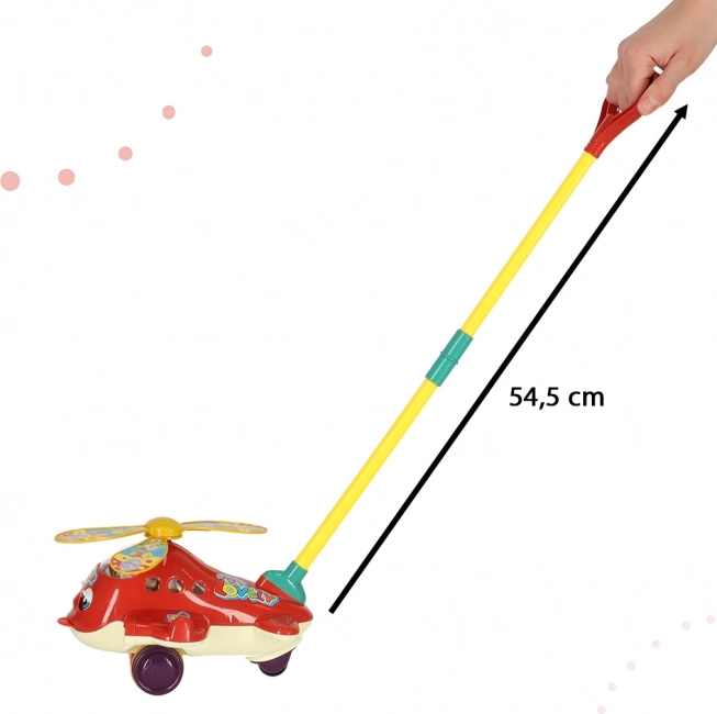 Design hračky zahrnuje živé barvy a veselé motivy, díky čemuž přitahuje dětskou pozornost. Červený vrtulník při pohybu točí vrtulemi a vydává zvuk zvonečku. Opěrná tyč je navržena tak, aby odpovídala výšce dítěte a lze ji snadno složit pro pohodlné skladování nebo přepravu.