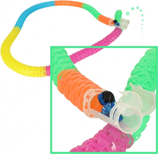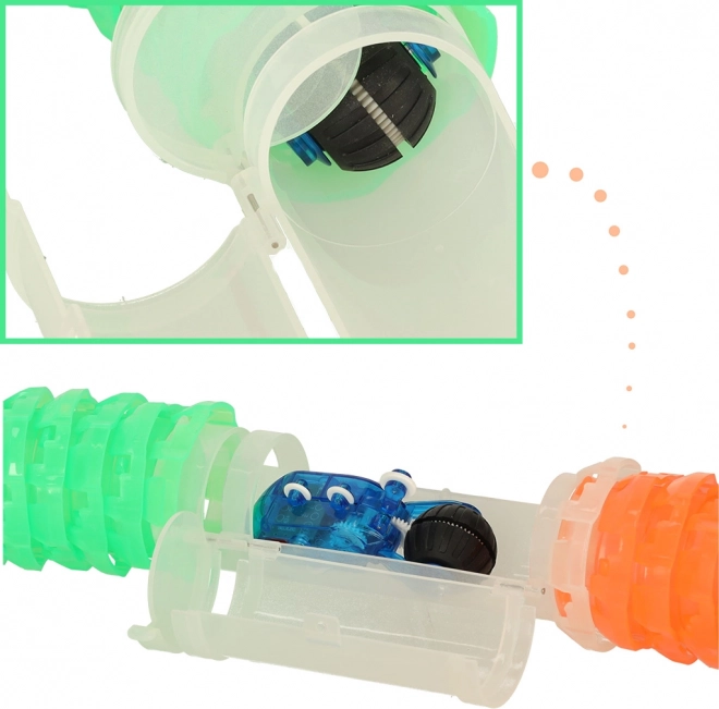 Kreativní složení dílů dovoluje stavbu dráhy ve dvou režimech: volně pro flexibilní zatáčky nebo pevně pro stabilní vertikální konstrukce. Autíčko navíc díky vestavěnému světlu přináší skvělý efekt při soumraku a zaručuje úchvatné představení.