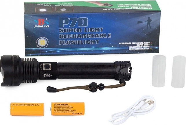 - svítilna P516-P70, 2× baterie 26650, USB kabel, originální balení