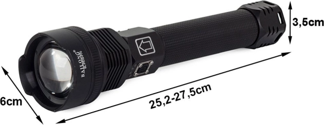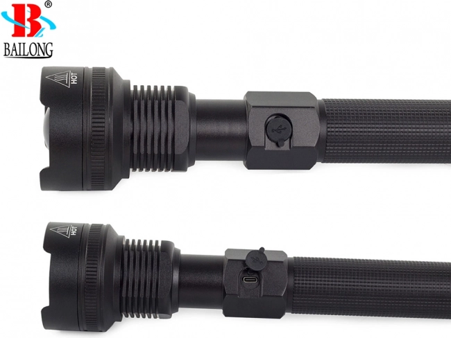 Výkonná taktická svítilna BAILONG s diodou CREE XHP70 pro spolehlivé osvětlení v terénu i doma. Nabízí dosvit až 1000 m, plynulý zoom, 3 světelné režimy, robustní tělo z leteckého hliníku s ochranou IPX5, USB nabíjení, napájení 2× 26650 a LED indikaci stavu nabití.