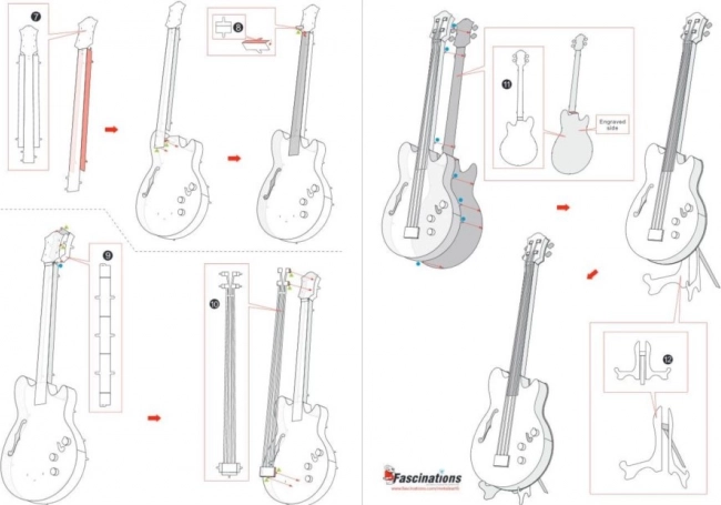 Laserem gravírované detaily, jako jsou struny, ladicí mechaniky a kontury těla, vytvářejí věrnou miniaturu basové kytary.