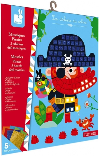 Zábavná kreativní sada pro malé dobrodruhy: mozaika s pirátskou tématikou od značky JANOD. Obsahuje 3 předlohy a 6 listů třpytivých a barevných samolepicích čtverečků. Děti si procvičí jemnou motoriku, soustředění i představivost a vytvoří si vlastní pirátské obrazy. Snadná aplikace samolepek, bohaté barvy a ideální na cesty pro děti od 5 let.