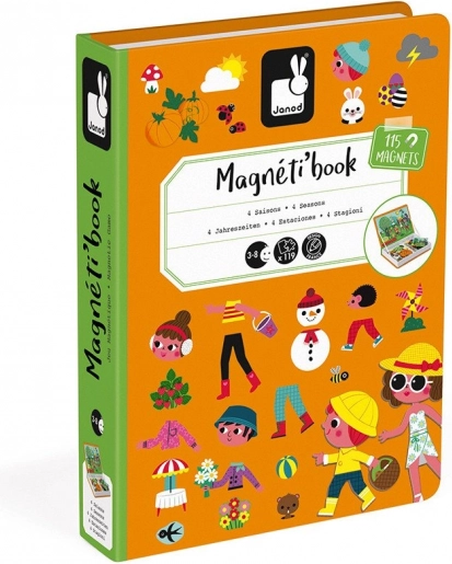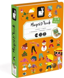 Magnetická kniha Janod Magnetibook – roční období rozvíjí fantazii, logické myšlení a jemnou motoriku. Děti podle kartiček skládají scény jednotlivých ročních období a vybírají k nim správné oblečení a doplňky. Díky kompaktnímu provedení ve tvaru knihy je ideální na cesty, do auta i na návštěvy.