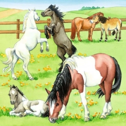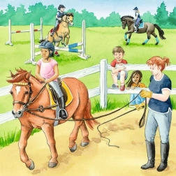Děti si poskládají hned tři různé scény – jízdu na koni s doprovodem, klidnou pastvinu i péči o koně ve stáji. Každý motiv přináší novou výzvu a radost ze skládání.
