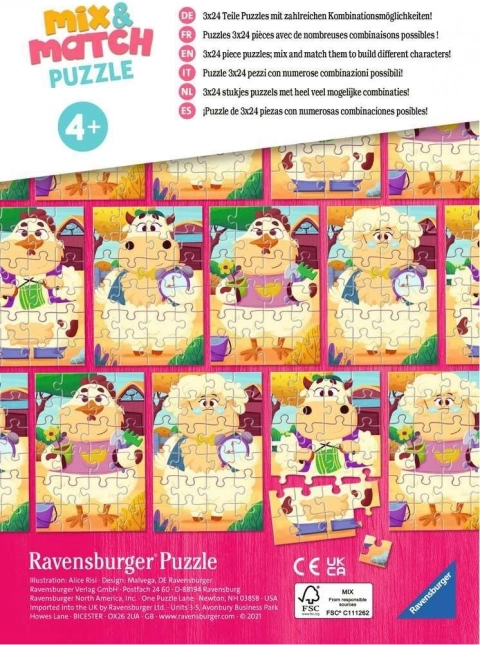Objevte chytrou kombinaci klasického skládání a kreativního mixování. Puzzle RAVENSBURGER Mix & Match: Moji přátelé z farmy přináší tři samostatné obrázky po 24 dílcích, které děti mohou skládat podle předlohy nebo mezi sebou kombinovat. Díky tomu vznikají nové a vtipné variace zvířátek a postav z farmy.
