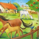 Sada obsahuje 2 samostatné puzzle s koňmi a životem na statku – ideální pro první skládání a rozšiřování představivosti.