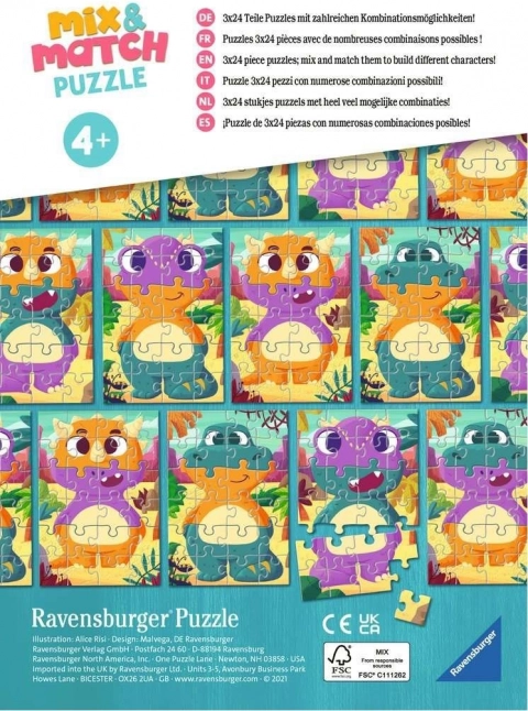 Sada tří dětských puzzle od značky RAVENSBURGER přináší kreativní koncept Mix & Match. Každý motiv lze poskládat klasicky podle předlohy, nebo si děti mohou dílky z jednotlivých obrázků libovolně prohazovat a vytvářet tak originální a vtipné kombinace roztomilých dinosaurů. Skvělá volba pro rozvoj fantazie, logiky a jemné motoriky.