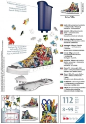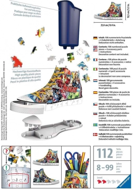 RAVENSBURGER přináší jedinečný zážitek s 3D teniskami, které můžete použít jako originální tužkovníky pro pera, pastelky nebo třeba štětce. Speciální zakřivené nebo ohebné dílky, které přesně zapadnou na své místo, umožňují postavit designovou tenisku s motivem marvelovských hrdinů Avengers, která působí velmi reálně. Dílky jsou vyrobeny z pevného plastu a zaručí vynikající stabilitu bez nutnosti lepení.