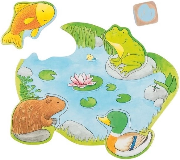 Děti se učí rozpoznávat různá zvířátka a jejich přirozené prostředí, jako je strom a rybník.