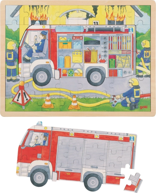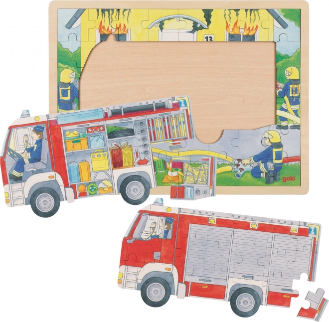 Vícevrstvé dřevěné puzzle hasiči při práci 59 dílků GOKI