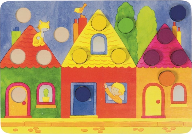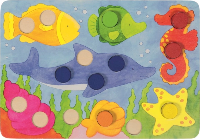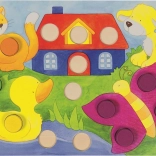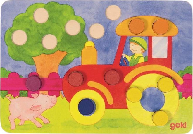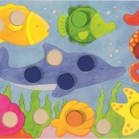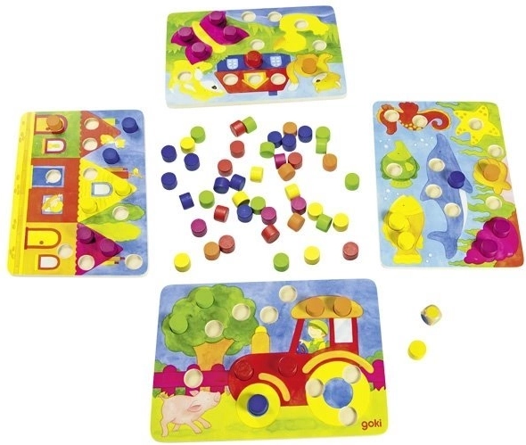 Tato vkládací hra GOKI přináší dětem radost z objevování barev a tvarů. Nejprve si mohou kameny vkládat do obrázků dle vlastní fantazie a trénovat prstíky. Postupně se naučí rozlišovat barvy a doplňovat obrázky podle zadání. Při hře s kostkou hráči vybírají barvu kamene podle toho, co padne – vyhrává ten, kdo nejrychleji správně doplní svůj obrázek.