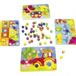 - 4 dřevěné obrázky, 90 barevných kamenů, barevná hrací kostka, návod
