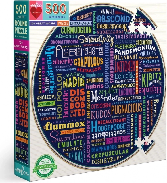 Objevujte 100 slov, která vás nejen pobaví, ale také vzdělají. Toto netradiční puzzle v kulatém tvaru nás přenese do světa jazykových her, které se stanou krásnou dekorací ve vašem pokoji po složení.