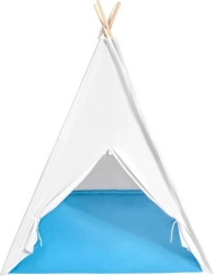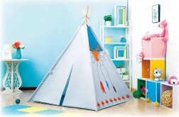 Stavba je snadná a rychlá: dřevěné tyče stačí propojit a svázat v horní části. Potah je z odolného polyesteru a podlážka zvyšuje pohodlí i na studené podlaze. Rolovací vstup a okénko zajistí cirkulaci vzduchu a hravou atmosféru. Po hře teepee jednoduše složíte a uložíte do skříně.