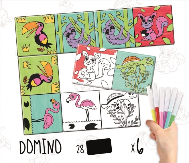 Zábavná hra domino pro děti s černobílými obrázky zvířátek, které mohou dle své fantazie vybarvit pomocí dodávaných fixů. Procvičujte postřeh a paměť se skvělou hrou, která nadchne každé dítě.