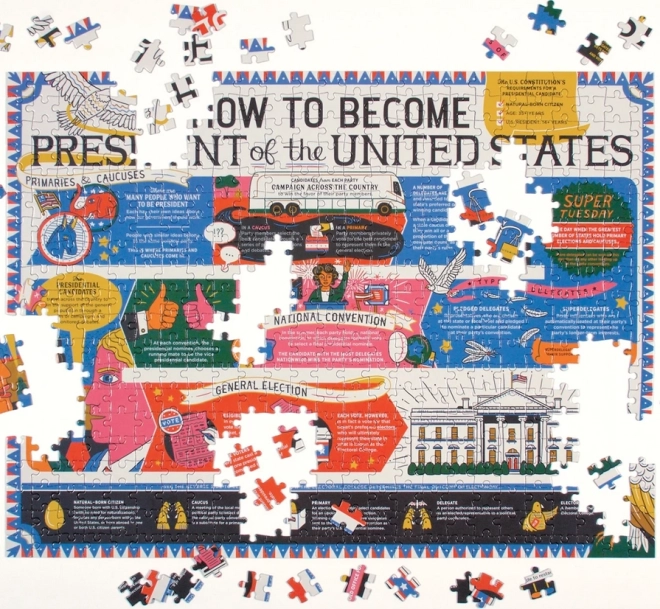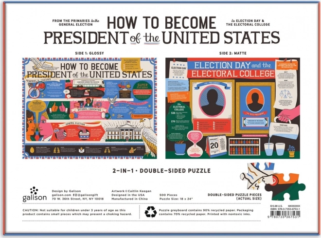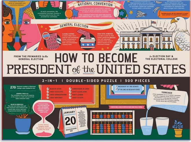 Objevte zábavnou a zároveň poučnou skládačku: oboustranné puzzle s tématem cesty do prezidentského úřadu USA. Užijte si 500 dílků, dvě odlišné strany (lesklá a matná) pro snadnější skládání a přehledný motiv s kroky od primárek až po volby. Součástí je i ilustrační obraz obou motivů.