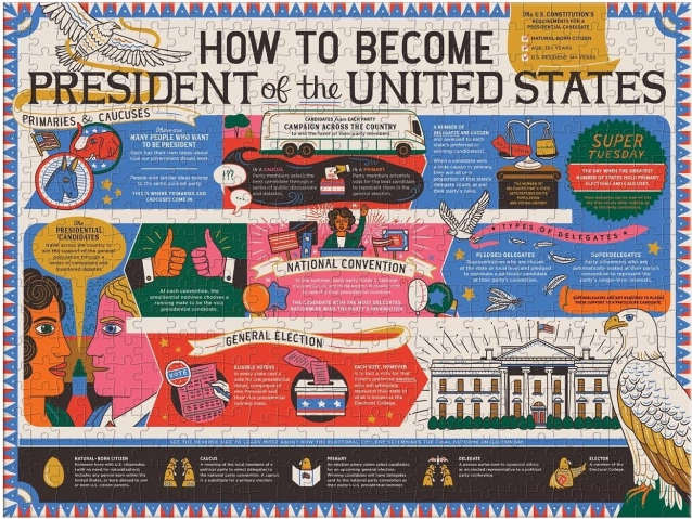 Toto oboustranné puzzle od značky GALISON nabízí dvojnásobnou porci zábavy. Z jedné strany je povrch lesklý, z druhé matný, což usnadňuje rozlišení motivů a zvyšuje komfort skládání. Téma vás provede milníky prezidentských voleb v USA – od primárek přes nominace až k finálním volbám.