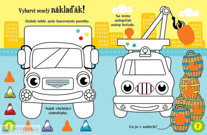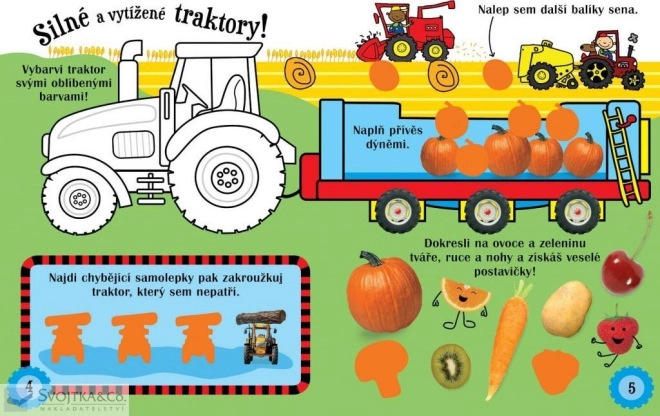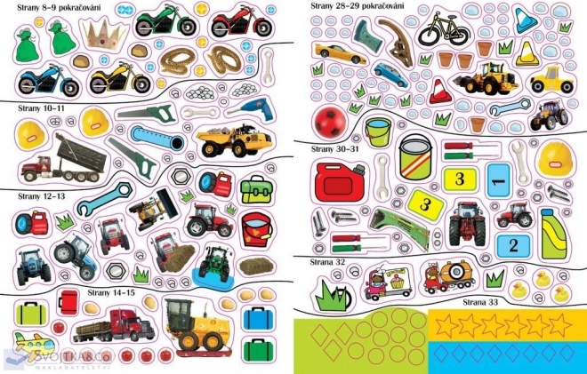 Tato kniha nabízí nekonečné hodiny zábavy pro malé i velké fanoušky silných strojů. Děti si mohou vyrobit vlastní vozový park a zapojit se do různých interaktivních úkolů, jako je nalepování aut na převozní kamion nebo vybarvování svých oblíbených traktorů.