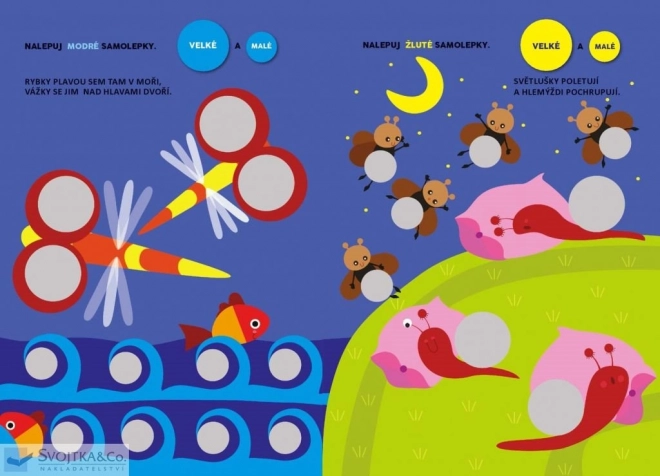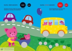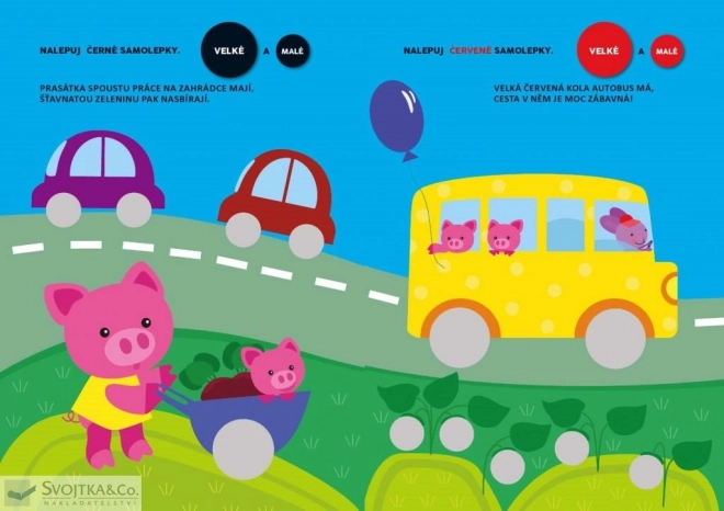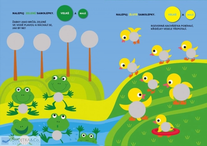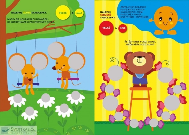 Díky samolepkám jako žabkám ve vodě nebo zajíčkům na výletech se děti naučí, jak správně přiřadit barvy a velikosti. Čekají na ně barevné obrázky, které upoutají jejich pozornost, a krátké texty s veselými rýmy na procvičení paměti.