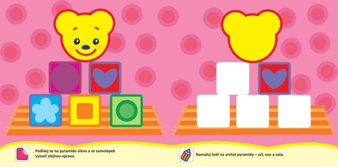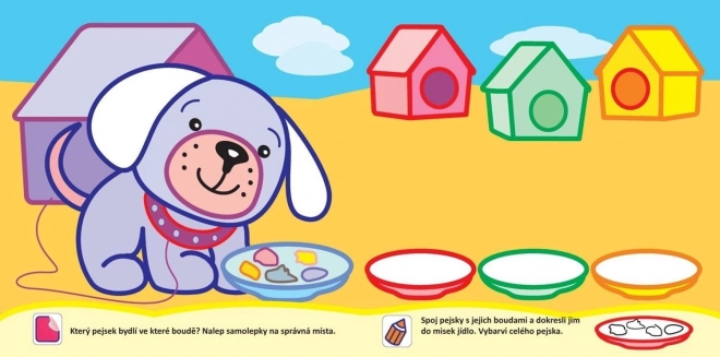 Úkoly jsou jednoduché a srozumitelné: dokreslení obličeje medvídka, třídění zvířátek na ta, co plavou a co žijí na souši, spojování pejsků s jejich boudami, hledání maminek koťátkům či dokreslování balónků a vln na vodě. Samolepky pomáhají dětem rozvíjet samostatnost a kreativitu.