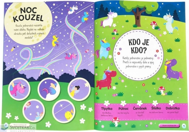 - Témata: jednorožci, víly, studna přání, duhové motivy