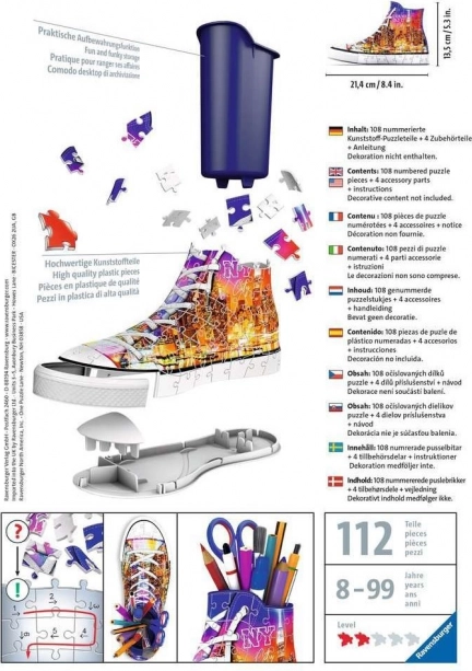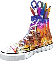 Tento 3D puzzle přináší inovativní a neotřelý tvar pro každého, kdo má rád spojování dílků a módní doplňky. Díky speciálním zakřiveným a ohebným dílkům, které přesně pasují na své místo, můžete postavit realisticky působící tenisku s motivem New York City – města, které nikdy nespí.