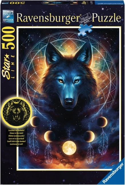 Objevte kouzlo skládání s puzzle Ravensburger svítící ve tmě – vlk a měsíce. Sada 500 dílků pro věk 12+ nabízí magický svítící efekt, precizní výsek a bezchybné lícování pro plynulé a zábavné skládání.
