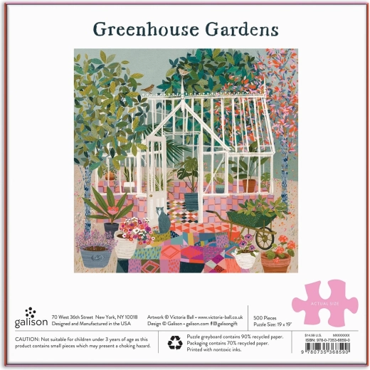 Užijte si relax s kvalitním puzzle o 500 dílcích s motivem skleníkových zahrad. Součástí balení je předloha motivu pro snadnější skládání. Puzzle je vyrobeno v USA a po dokončení má rozměr přibližně 49 × 49 cm.
