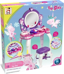 Proměňte dětský pokoj v malé kosmetické studio. Toaletní stolek CHICOS Top Star s motivem jednorožců nadchne své malé majitelky barevným provedením a praktickými doplňky. Součástí je stolička a sada 12 kusů příslušenství, jako jsou flakonky, fén, čelenka a sponky, které podněcují nápaditou hru.