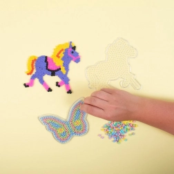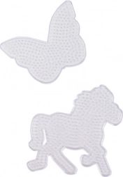 Vytvářejte barevné obrázky ze zažehlovacích korálků s praktickými podložkami PLAYBOX. Průhledný materiál umožňuje umístit pod podložku předlohu (není součástí balení) a pohodlně podle ní skládat. Set obsahuje dva oblíbené tvary – motýla a koně – které potěší malé i velké tvůrce.