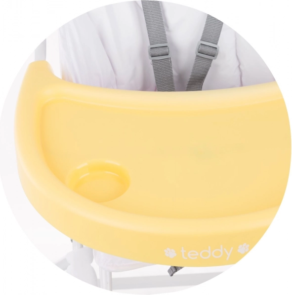 Jídelní židlička Chipolino Teddy je skvělým pomocníkem pro každodenní krmení. Díky širokému sedáku a měkkému potahu poskytuje dětem maximální pohodlí, zatímco 5bodové pásy a stabilní konstrukce zajistí bezpečí při každém jídle. Praktický pultík se snadno čistí a nabízí dostatek místa pro nádobí i oblíbené svačinky.
