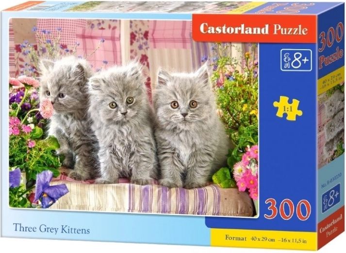 Puzzle 300 dílků Tři šedá koťátka nabízí příjemnou zábavu pro celou rodinu. Po složení získáte jemný a detailní obrázek tří roztomilých koťátek o velikosti 40 × 29 cm. Díky pevným dílkům a přesným výřezům je skládání pohodové a výsledek působí velmi esteticky.
