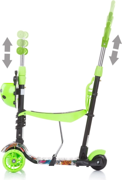 Univerzální konstrukce umožní rodičům dítě vést pomocí vodicí tyče, začátečníkům jezdit jako na odrážedle a pokročilejším užívat plnohodnotnou koloběžku.