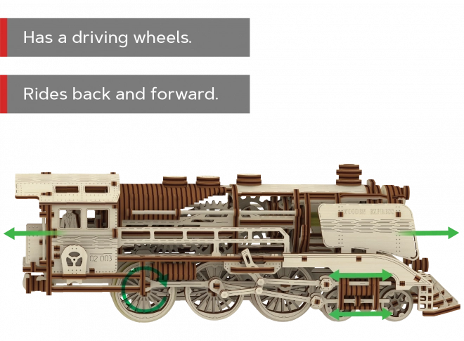 Lokomotiva využívá gumičkový motor a ozubená kola, takže po natažení skutečně jezdí dopředu i dozadu. Převody a pistony uvidíte přímo v akci.
