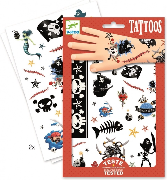 Vydejte se na dobrodružství na širém moři s dočasnými tetováními DJECO s pirátskou tématikou. Jemné ilustrace, syté barvy a zábavné motivy potěší děti i rodiče – ať už jde o narozeninovou oslavu, karneval nebo odměnu za šikovnost.
