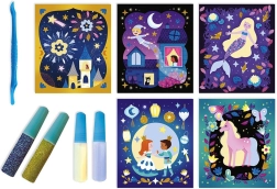 Objevte kreativní sadu, se kterou si děti vytvoří vlastní svítící obrázky z písku. Jednoduše pomocí špachtle odlepí vyznačené samolepicí části, nasypou třpytivý barevný písek a vykouzlí magické motivy, které září ve tmě. Přebytečný písek snadno vrátíte zpět do tuby.