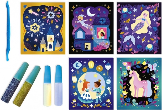 - 5 obrázkových karet, 1 špachtle, 4 tuby s třpytivým barevným pískem