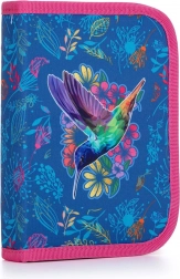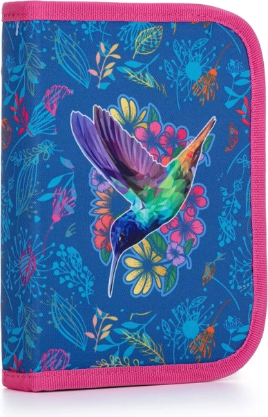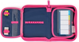 Penál je jednopatrový, disponuje gumovými poutky pro uchycení psacích potřeb a má průhlednou fólii pro rozvrh hodin, což usnadňuje organizaci školních potřeb.
