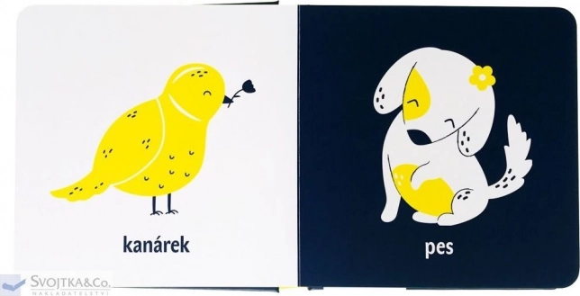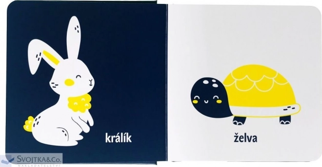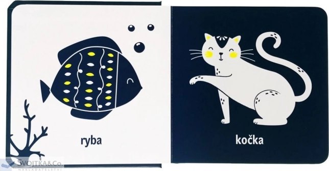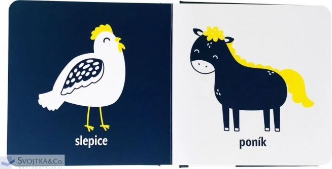 První obrázková knížka pro miminka s domácími zvířaty v kontrastním provedení. Jednoduchá černobílá grafika s jednou výraznou barvou podporuje zrakové vnímání, pevné leporelo s oblými hranami skvěle padne do dětských ručiček. Ideální první kniha pro rozpoznávání zvířat jako kočka, králík, pes či prase.