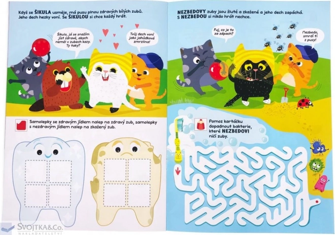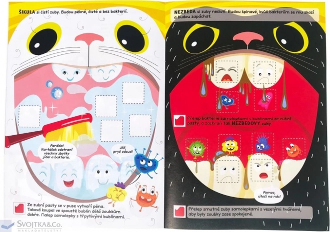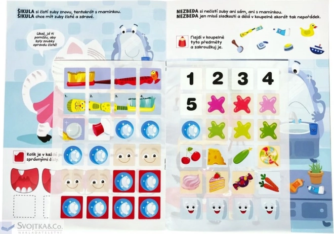 Zábavná dětská knížka se samolepkami, která děti hravou formou učí správné návyky při čištění zubů. Seznamte se s brášky Šikulou a Nezbedou a objevte, proč je správná dentální hygiena tak důležitá. Knížka nabízí jednoduché úkoly, dokreslování a samolepky, které motivují k pravidelnému čištění zoubků.
