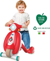 Stylové dětské chodítko a odrážedlo inspirované ikonickou Vespa pomáhá dětem s prvními krůčky i tréninkem rovnováhy. Má ergonomický design, stabilní konstrukci a praktický úložný prostor na drobné hračky. Vyrobeno ze 100% recyklovaného plastu, šetrné k přírodě a ideální pro děti od 10 do 36 měsíců.