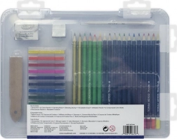 Univerzální 35dílná kreslicí sada v praktickém plastovém boxu od značky ROYAL & LANGNICKEL pro začátečníky i pokročilé. Obsahuje akvarelové pastelky, barevné uhly, fluorescenční a metalické tužky a také nezbytné příslušenství pro pohodlné kreslení doma i na cestách.