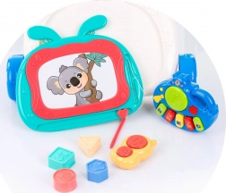 - kreslící tabulka s perem, mini pianino/klávesy, „telefon“, ozubená kola, vkládací tvary